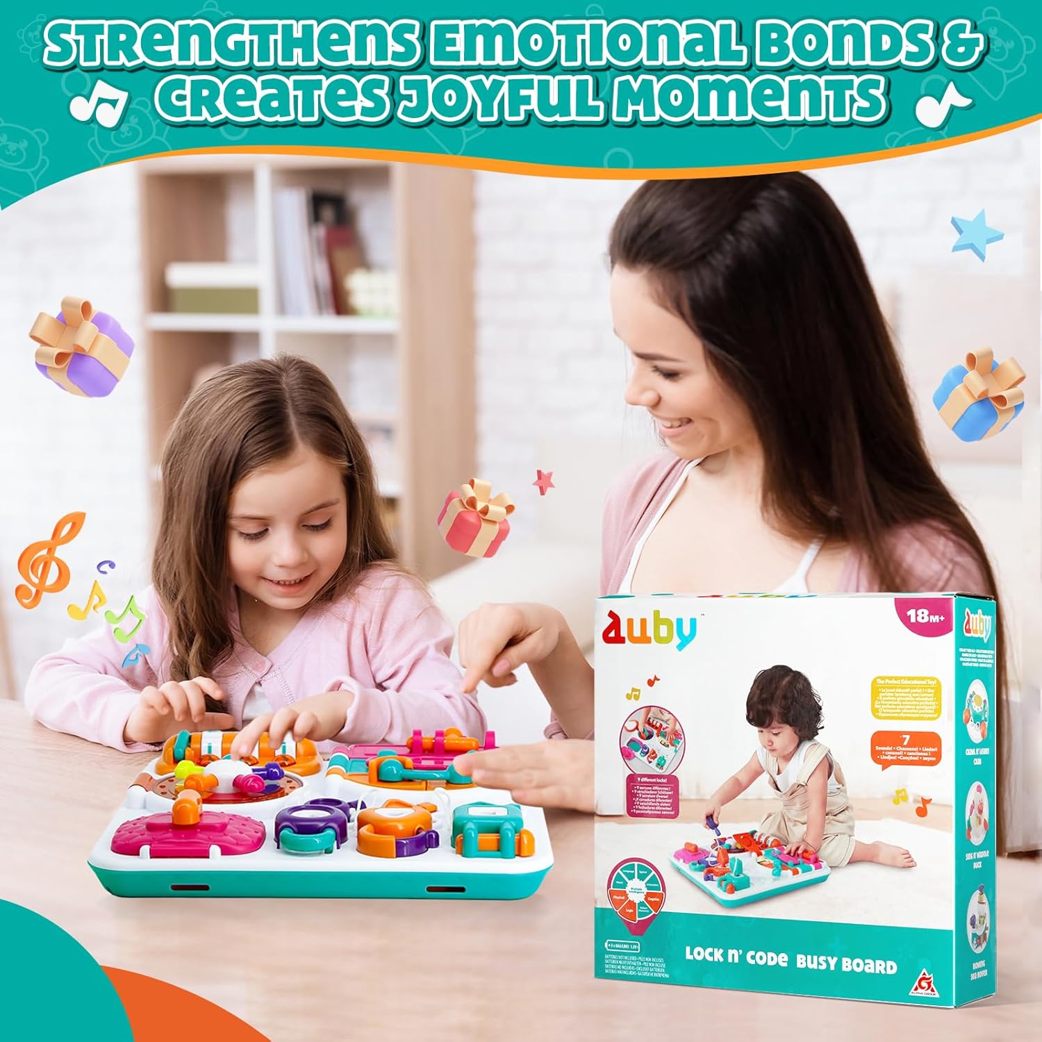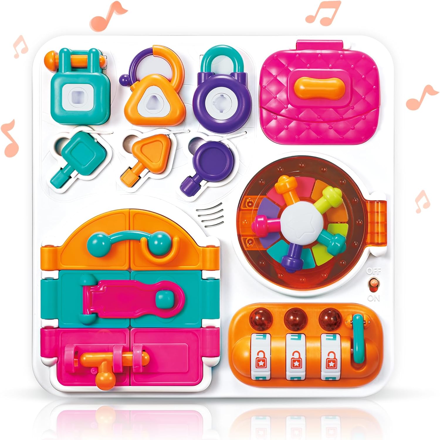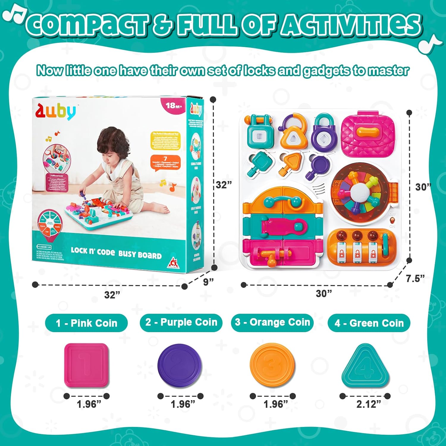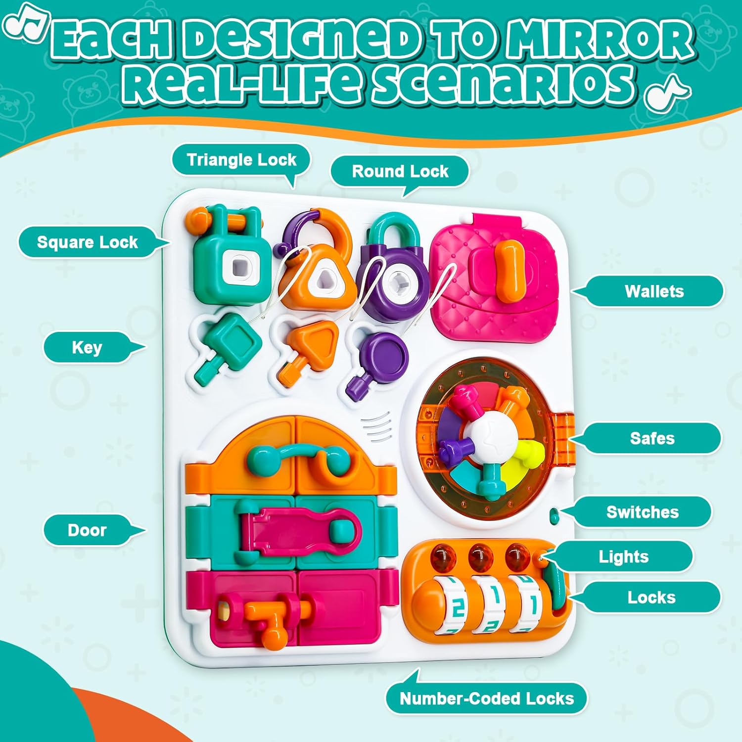 הלוחות העסוקים לפעוטות כוללים 9 מנעולים ומנגנונים שונים המחקים תרחישים בחיים האמיתיים,