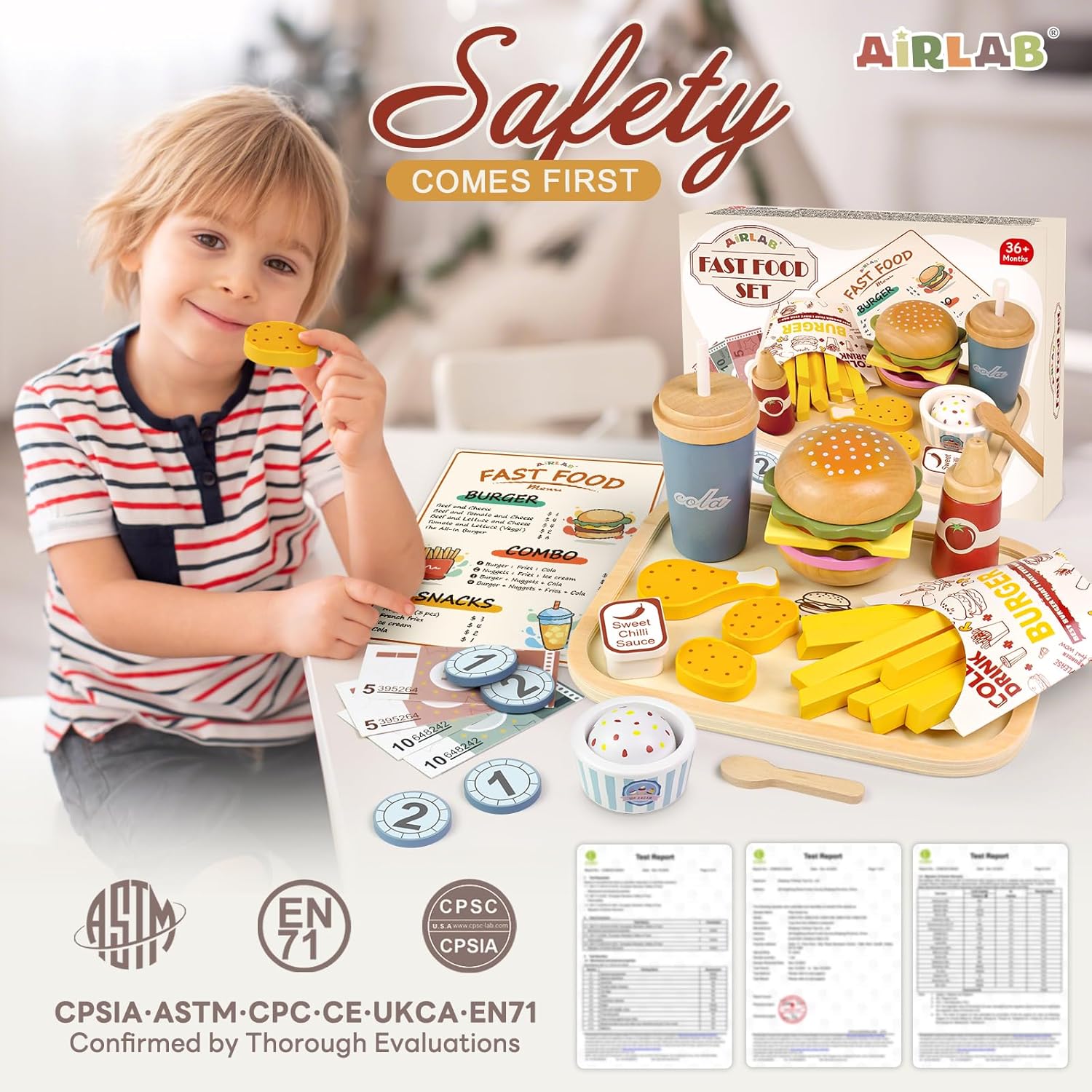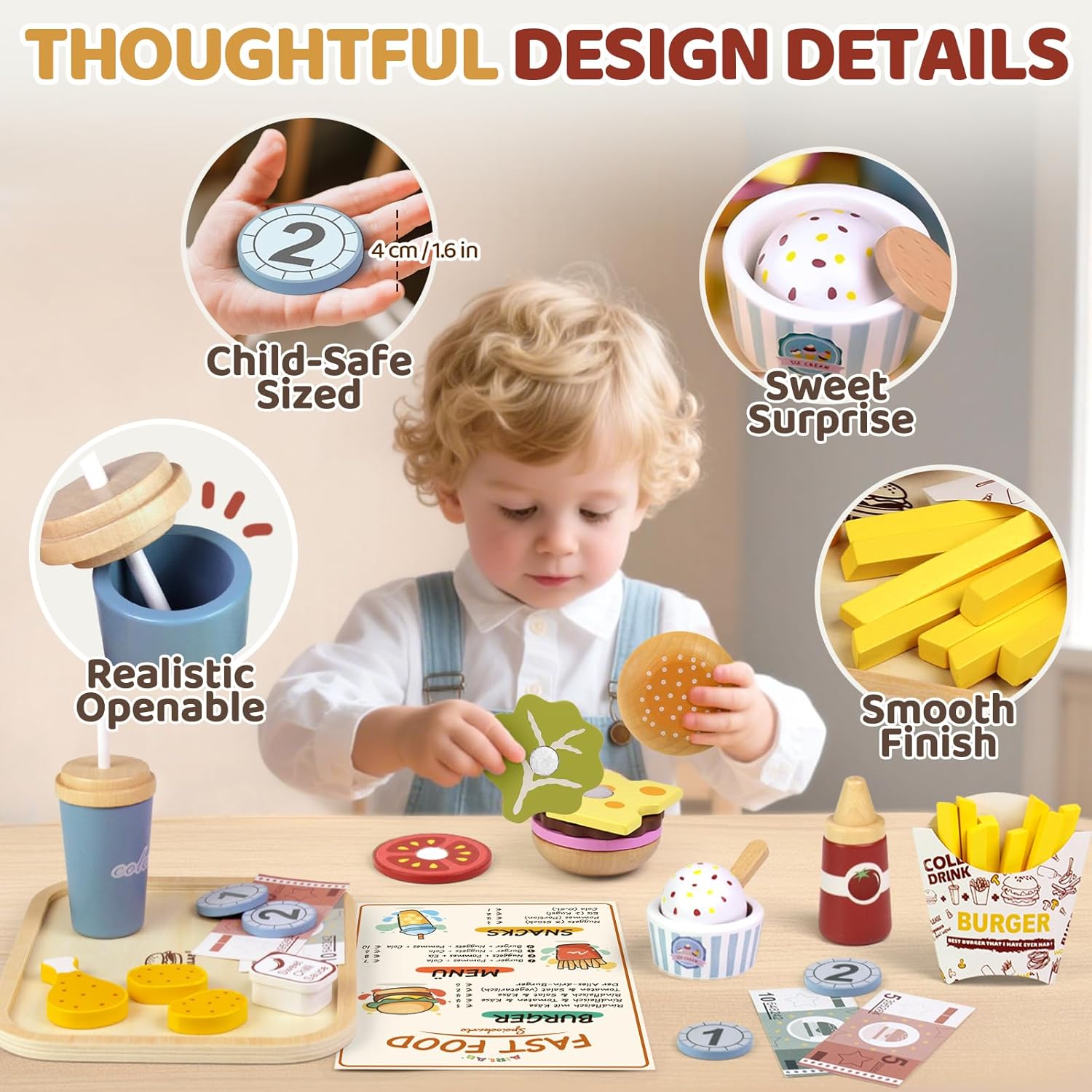 ערכות משחק מזון מהיר מיוצרות בקפידה מעץ יציב עם קצוות חלקים ומעוגלים וצבע לא רעיל.