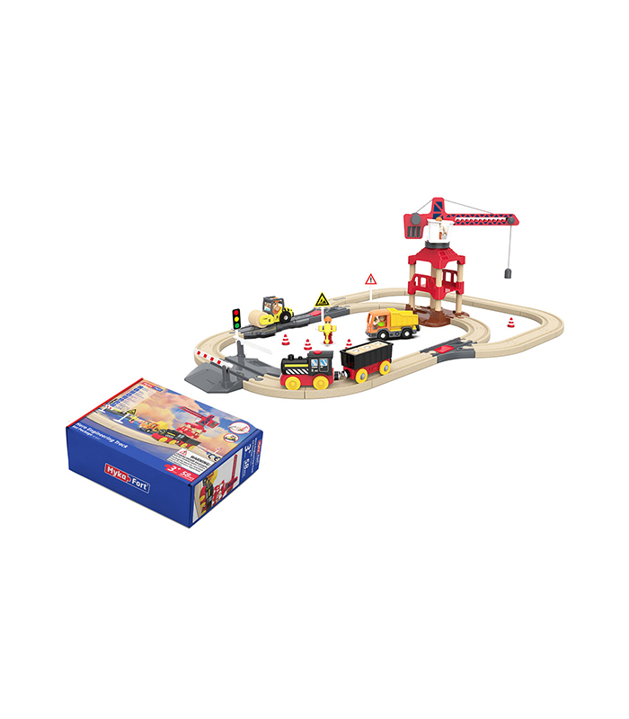 רכבת עץ חשמלית בת 58 חלקים שדוהרת למשימות הנדסה מעניינות.