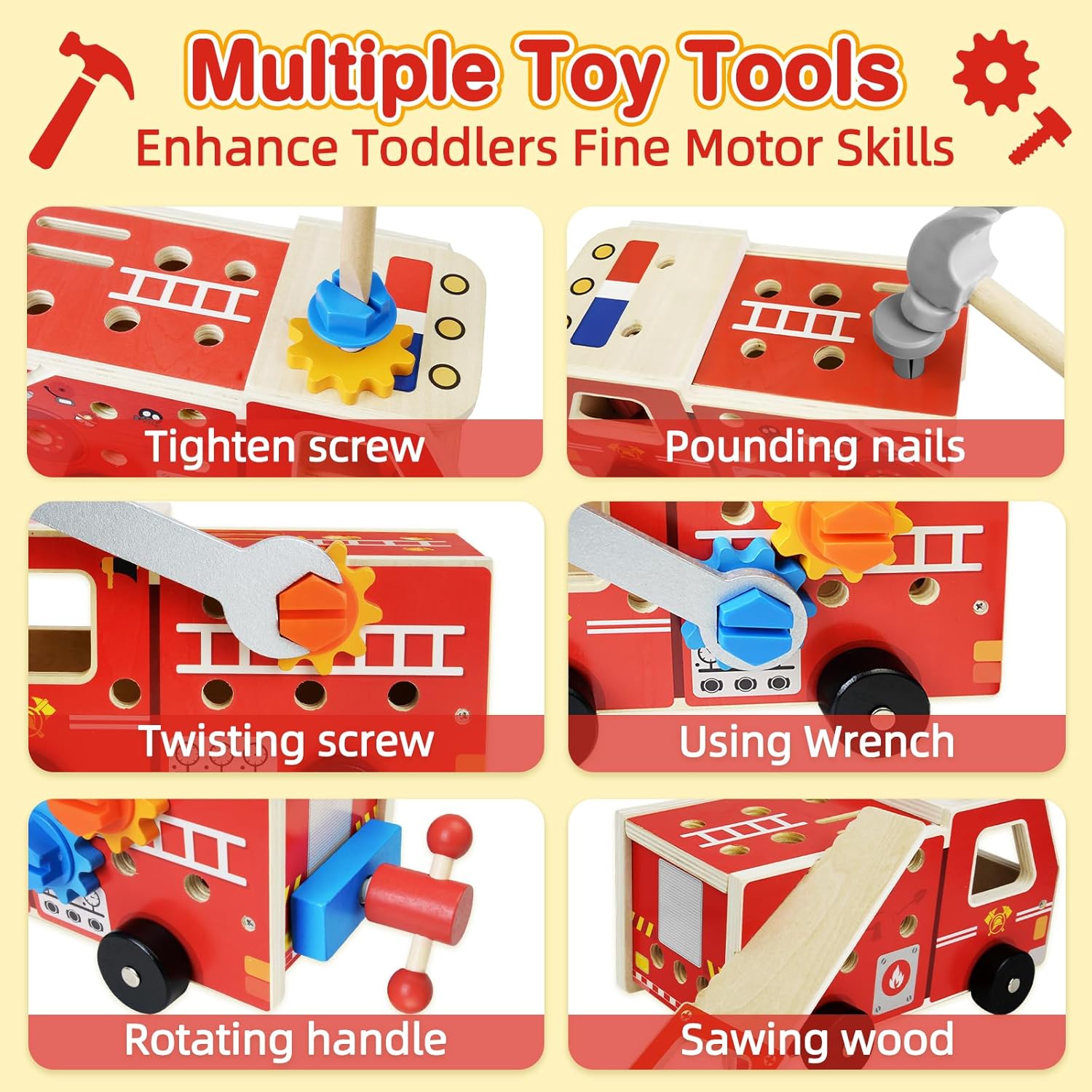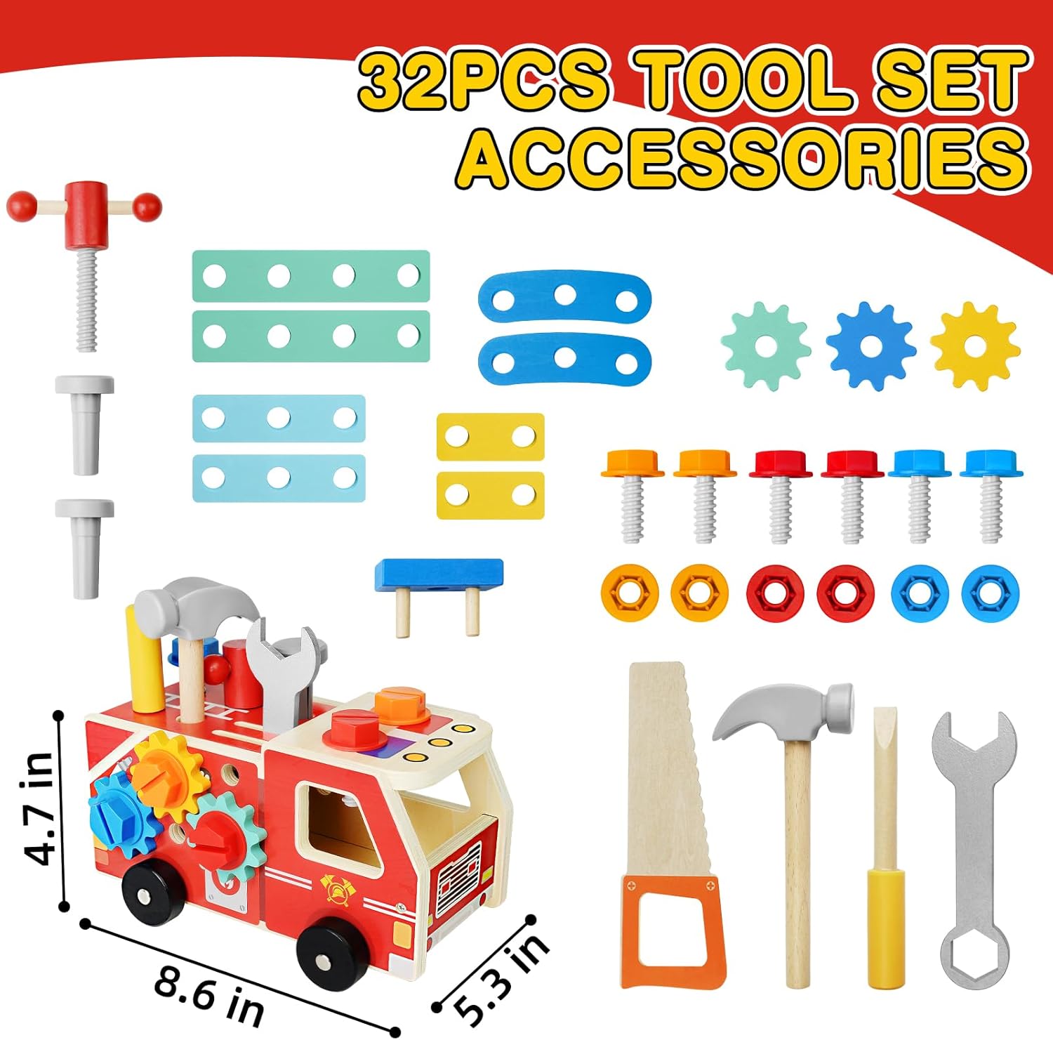 המשחק כולל 32 חלקים: 1 x משאית כיבוי אש לכלי עץ; 1 x מפתח ברגים;