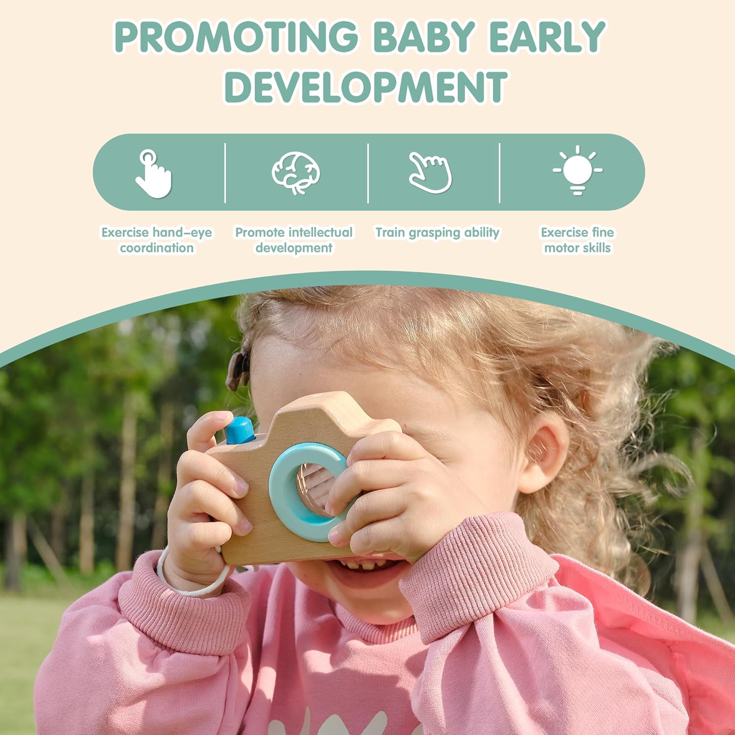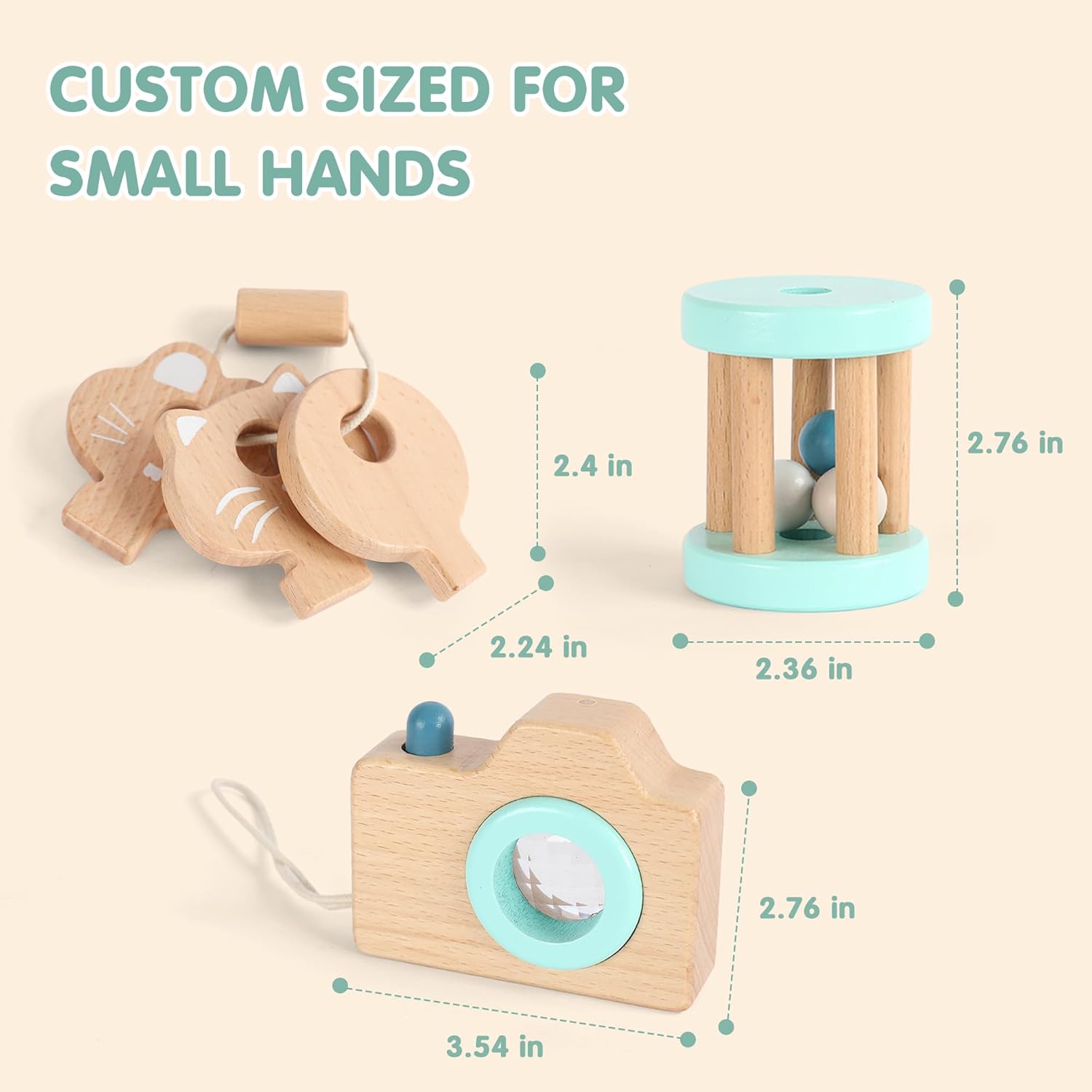 צעצועי התינוקות מעץ עשויים מעץ איכותי וצבע על בסיס מים שאינו רעיל, עם משטח חלק וללא קוצים.